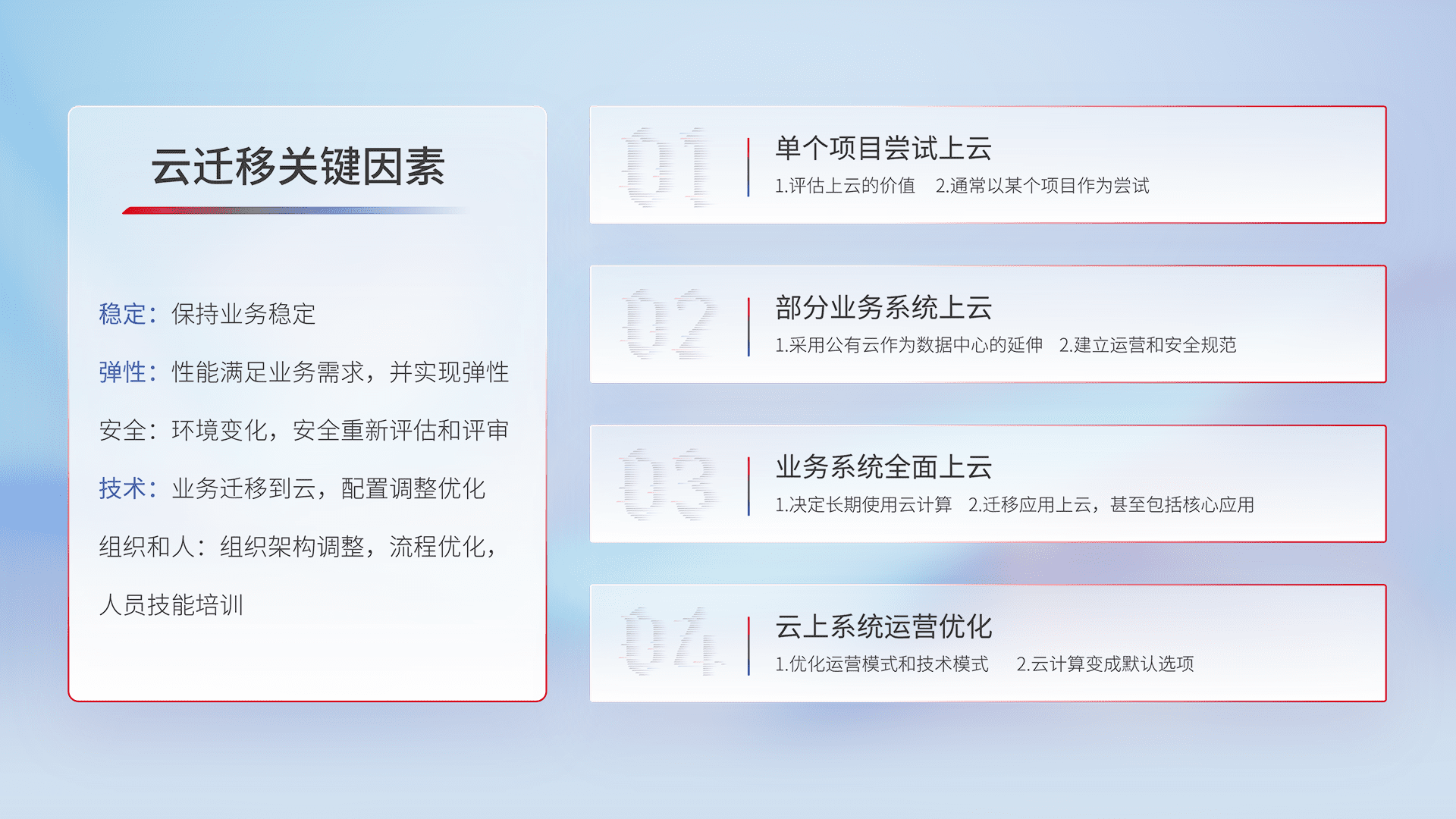结合实际业务,,,,从规划设计、、、、云平台选型、、、、云原生改造、、、、数据迁移、、、、集成交付,,,,迁移全过程为客户识别最佳上云路径,,,,做好风险识别管理,,,,设计网络架构、、、身份权限、、安全审计合规、、、操作审计、、日志审计、、监控告警策略、、、多站点容灾设计等,,,,对云上基础设施进行整体规划,,,提升IT治理水平,,以满足弹性、、、高可用、、、高性能的需求。。